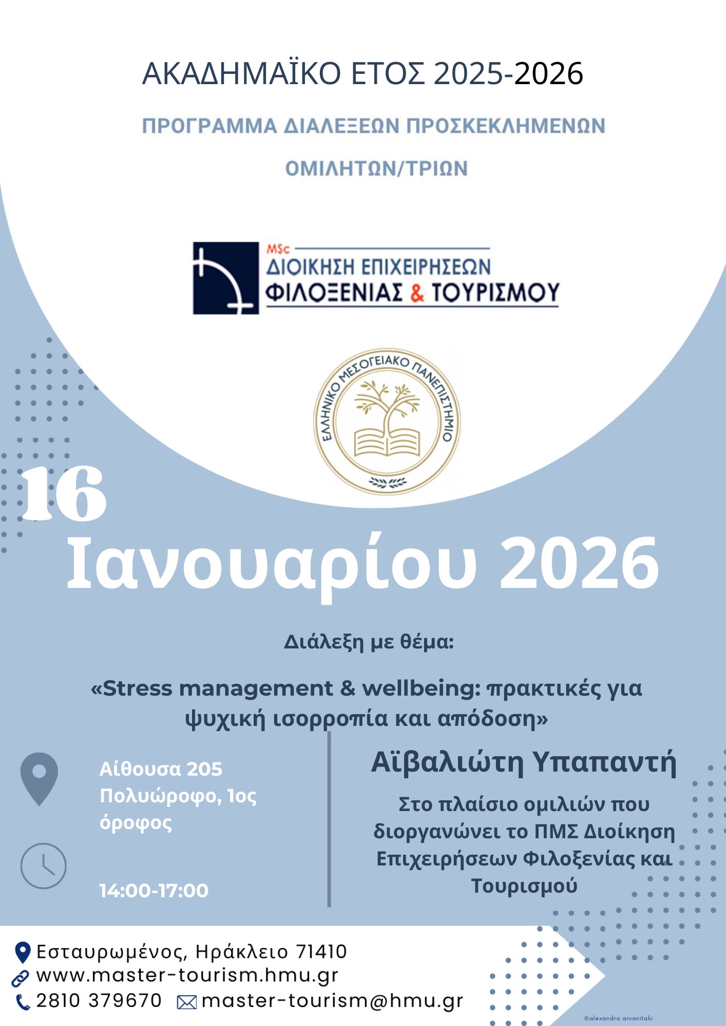 Το ΠΜΣ Διοίκηση Επιχειρήσεων Φιλοξενίας και Τουρισμού διοργανώνει την Παρασκευή 16 Ιανουαρίου 2026 μια πολύ ενδιαφέρουσα ομιλία με θέμα :
